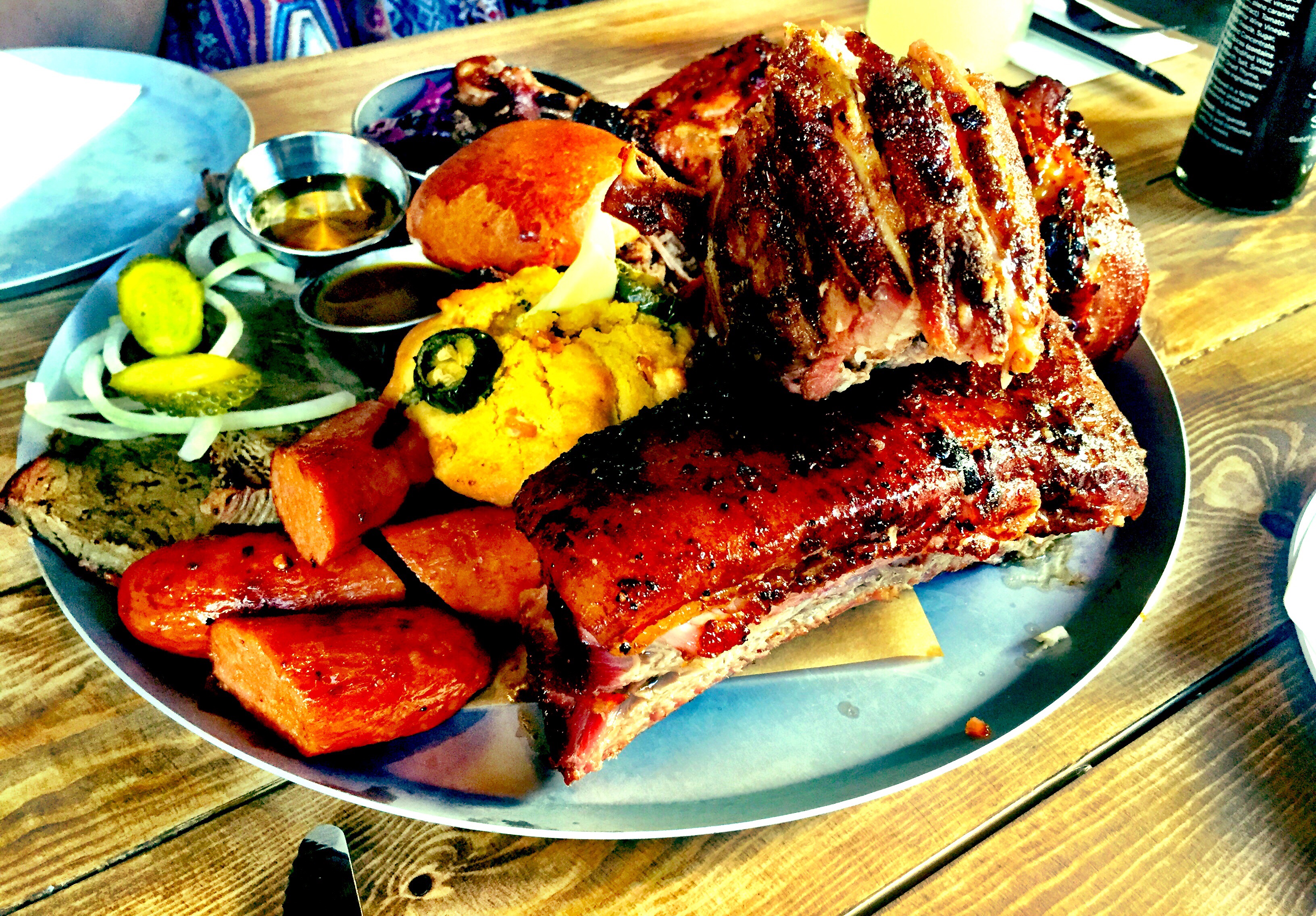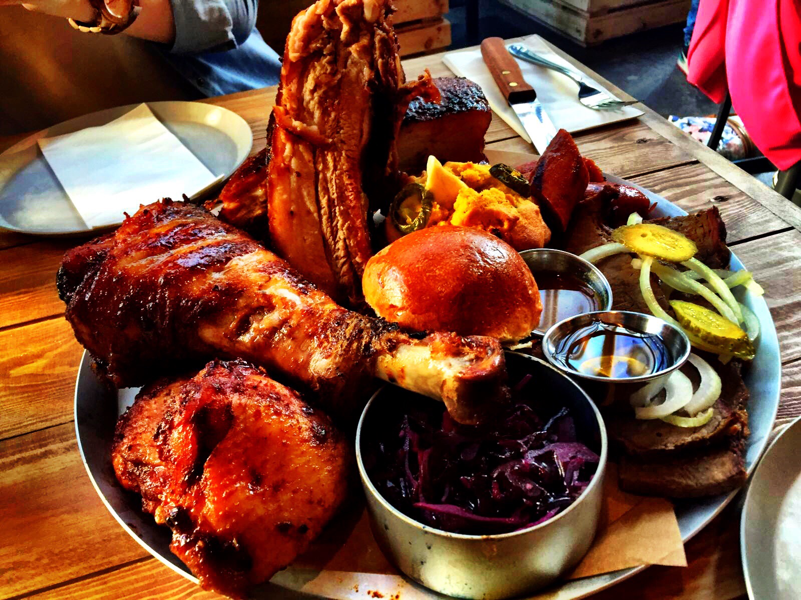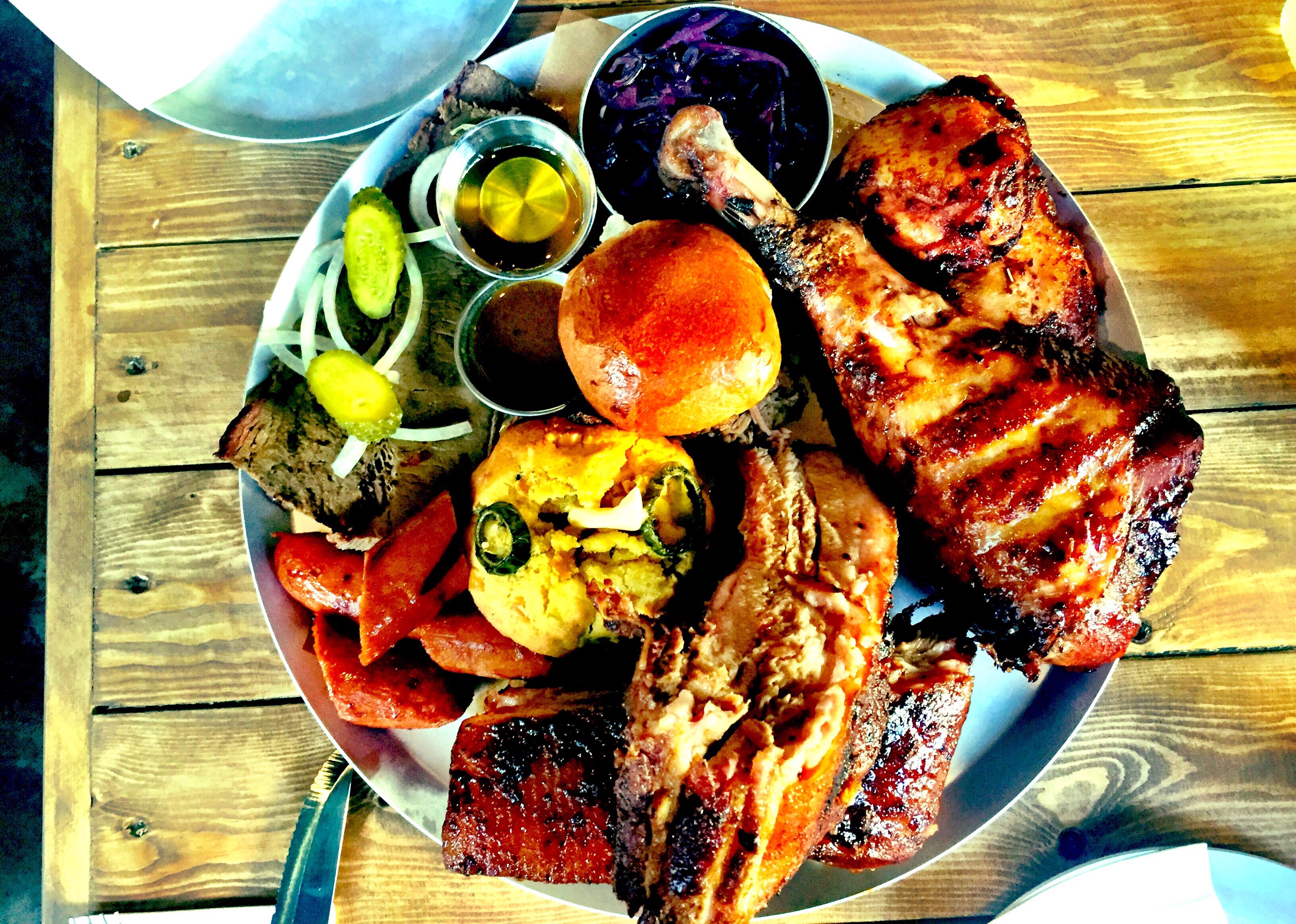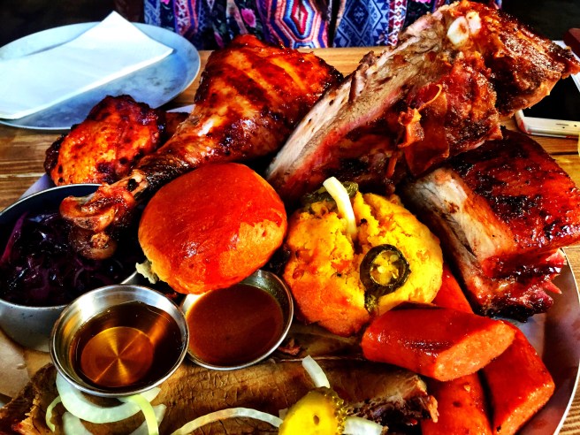 But what is this mountain of masterfully crafted meat Kirsty? I hear you ask, well babes; we got oursevels a big ole turkey leg, we got slow cooked brisket, we got St Louis ribs, a jalepeno cornbread muffin, a cheeky wee pulled pork slider, chicken thighs, some pickled slaw, outrageous sausage and to juice it all up a little honey mustard & regular honey…. hot diggity damn just LOOK at it!!!!!!!!!