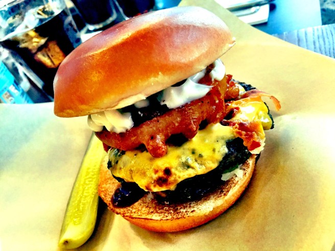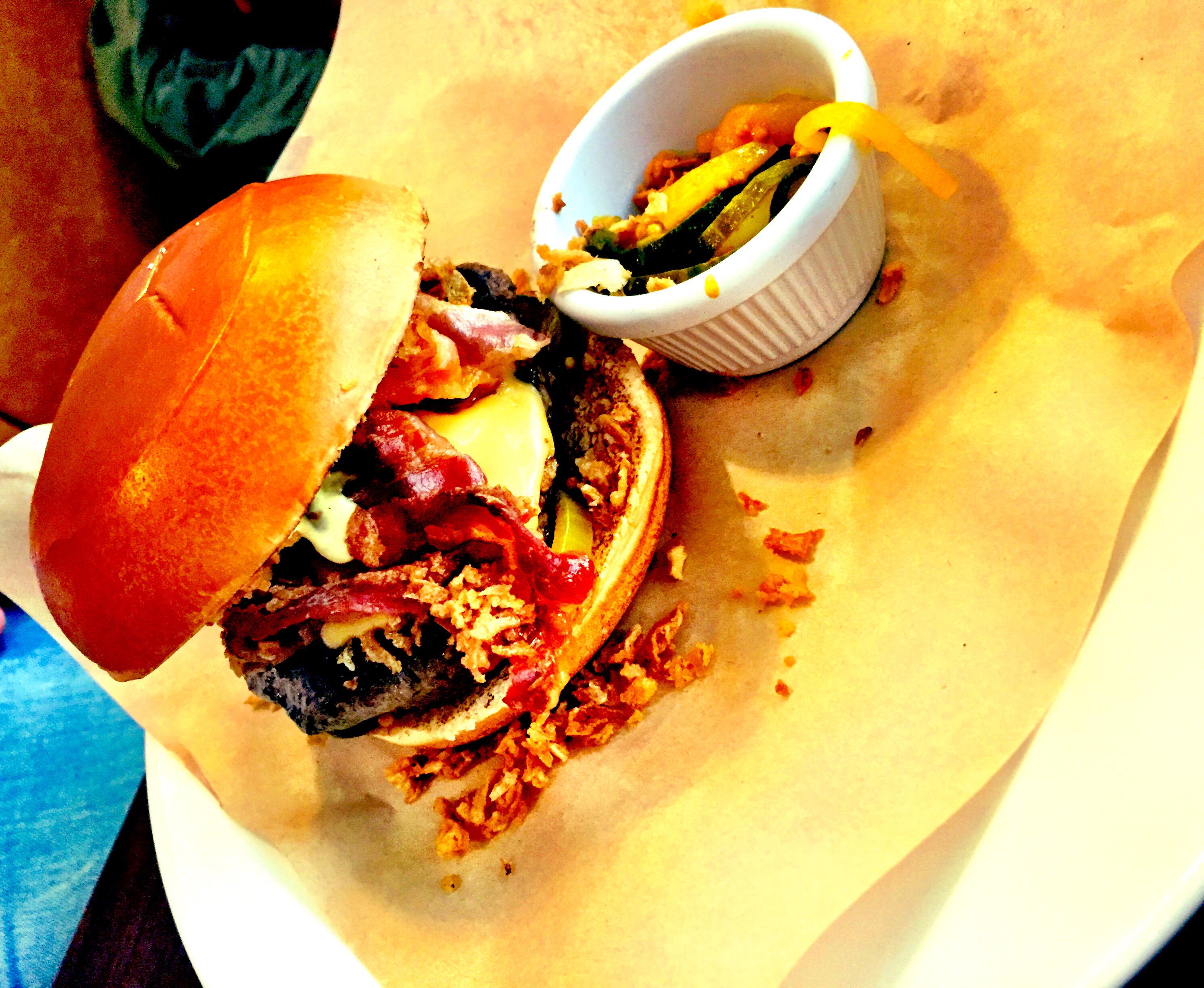 With an onion ring, streaky bacon, jalepenos, cheese, pickles, onions, bbq sauce and mayo this wee baddie did not disappoint! I cut up the pickle on the side and added for a bit more sweetness and a little more juice (you gotta have juice on dat meat gurl). Despite its height and stacking, the burger maintained its integrity pretty well as I ascended upon it with feverish hunger- which was great because I hate going back to work with half my lunch on my top, face, eyebrows ya know? It was delicious!