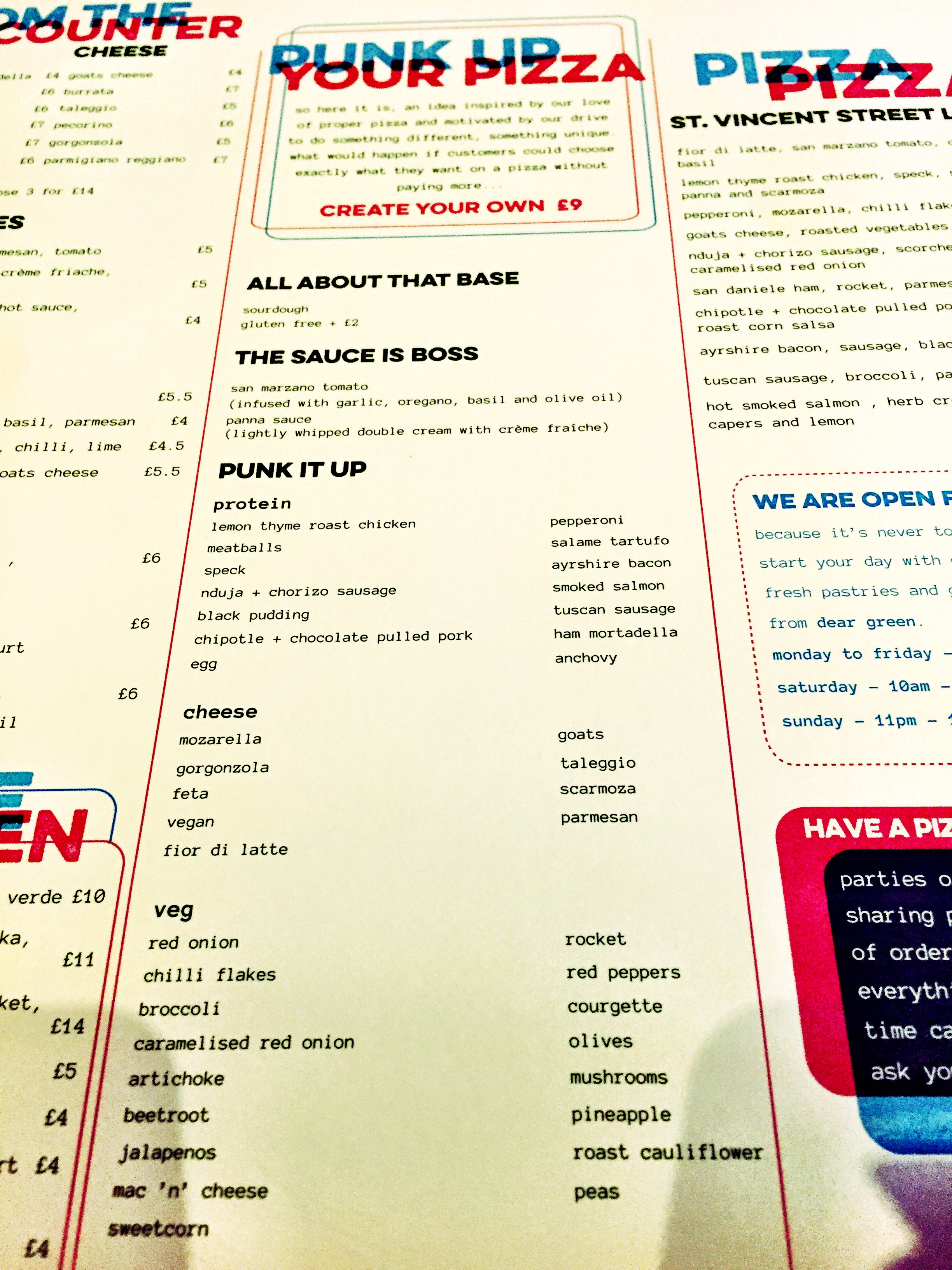 So what makes Pizza Punks any different from your regular pizza pie house? Well my sweet, they’ve decided to put you in the driving seat and create a ‘build your own’ menu fit for a King (or Pizza Queen) Punk Up your Pizza- £9 and you can load that baby up with AS MUCH as you can handle. Giving you unlimited choices and concoctions to keep your visits there as fresh as the doughy goodness that you are about to consume…here’s your options sugar…